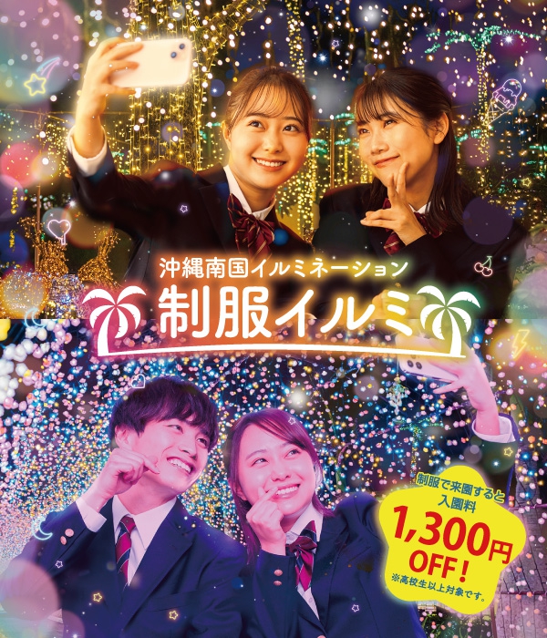 | ●制服イルミ割引について | 割引価格について【クリスマス年末年始スペシャルナイト】・期間2025.12/20 ~ 2026.1.4 2026.1/10 ~ 1.121DAYパス…2,850円 → 1,550円 ※クリスマス年末年始イベント期間中は、1DAY 料金適用です。 夜の部の販売はございません。 花火やファイヤーショーが楽しめる \クリスマス年末年始スペシャルナイトの情報はこちらから/ 【沖縄南国イルミネーション】・期間2026.1/5 ~ 1/9、1/13~2/281DAYパス…2,850円 → 1,550円 夜の部…2,500円 → 1,200円 \沖縄南国イルミネーションの情報はこちらから/ |