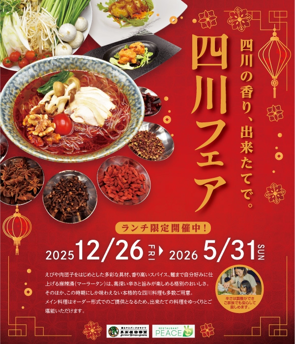 | 開催期間 | 四川フェア 2026年5月31日迄 【レストラン利用について】 ※定休日:火曜日・水曜日 ※貸切利用や混みあうことがありますので、 事前のご予約をおすすめしております。 ※営業日は こちらをご確認ください。 |