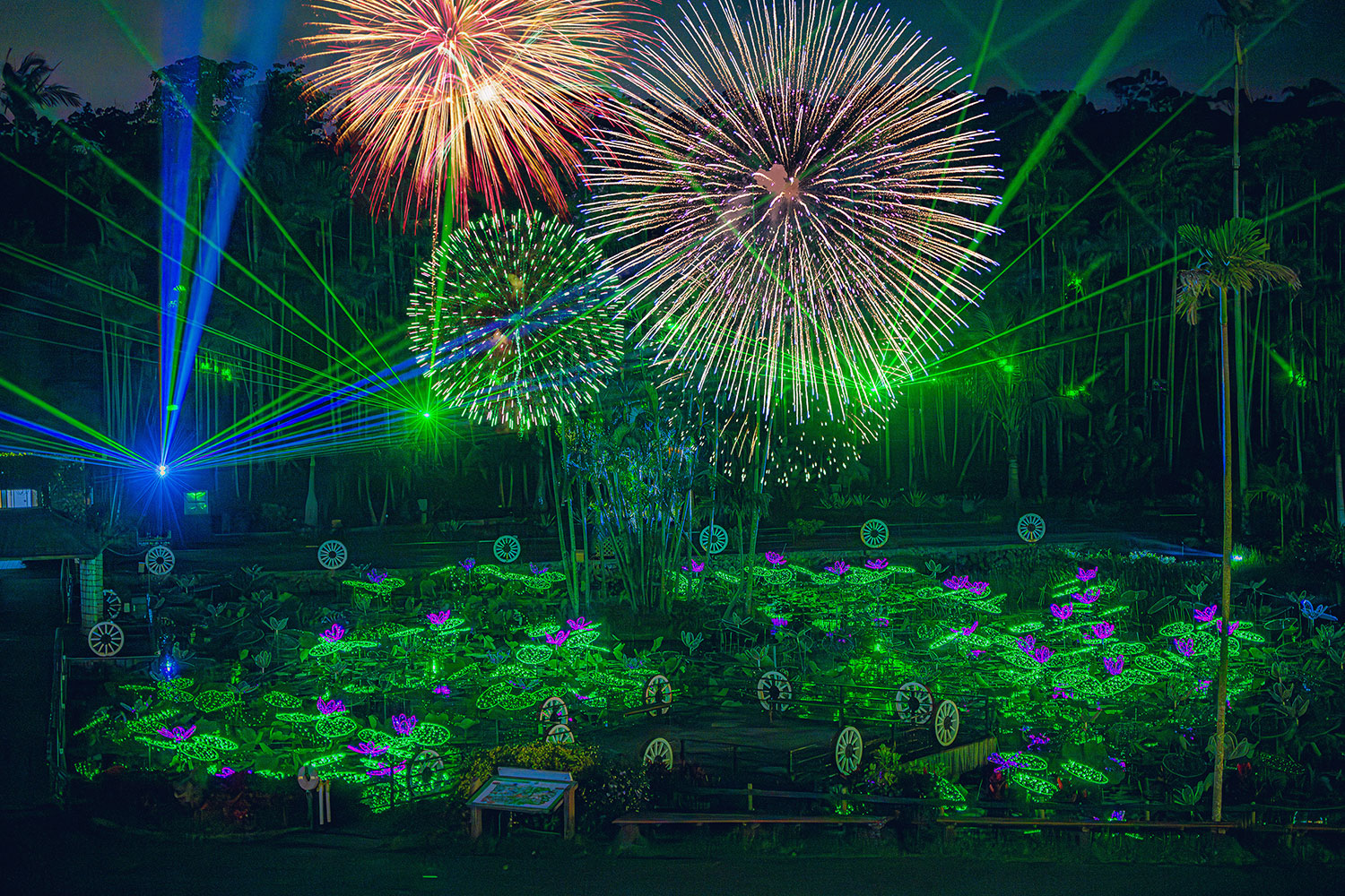 A magical fusion of fireworks, lasers, fire effects,